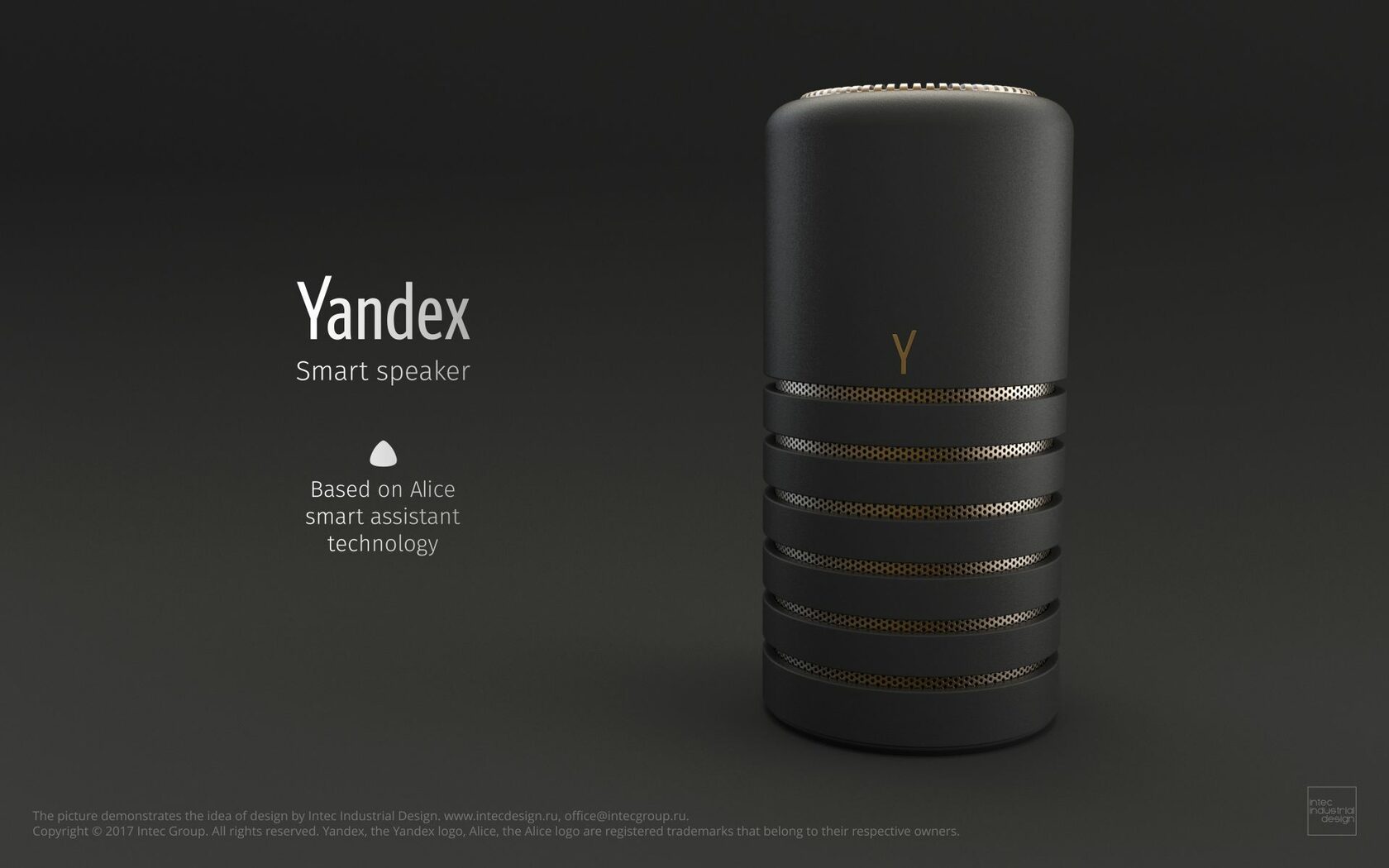 Yandex smart speaker — это концепт-дизайн первой умной колонки работающей на новом голосовом ассистенте «Алиса». Колонка обладает сильным, отличительным и зрелым дизайном. Сбоку продукт привлекает внимание благодаря узким щелям по кругу куда глубоко посажена алюминиевая решетка. Сверху аккуратно расположились круглый 1,8" сенсорный OLED дисплей и "круговой" алюминиевый регулятор громкости с насечками. Каменный цвет корпуса с грубой шершавой обработкой отлично подчеркивает золотистые металлические детали.